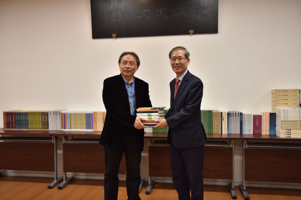当天与签约仪式共同举行的,还有韩国国学振兴院向文史研究院赠送图书资料的仪式。作为学术交流协议内容的一部分,国学振兴院向文史研究院赠送了其馆藏及整理出版的文献资料137种,共计308册。所赠图书包括《韩国金石文集成》《国学振兴院影印丛书》《国学振兴院国译丛书》《岭南先贤文集国译丛书》《安东历史人物国译丛书》《韩国儒学资料国译丛书》《文集解题》等文献丛书以及部分图录资料。这批赠书将在文史研究院资料室上架,供研究者使用。