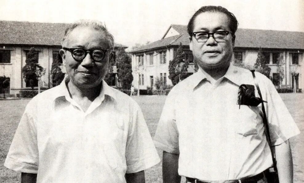 杨宽教授(左)和西嶋教授合影于复旦大学历史系校舍前(1979年)