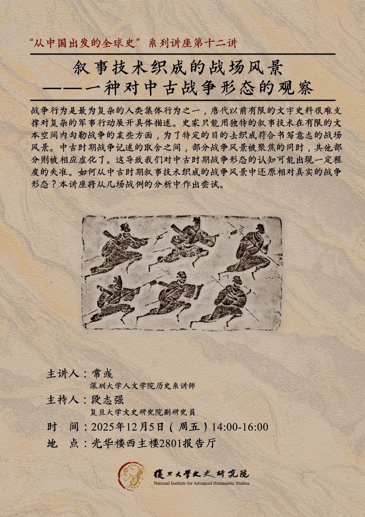 战争行为是最为复杂的人类集体行为之一,唐代以前有限的文字史料很难支撑对复杂的军事行动展开具体描述。史家只能用独特的叙事技术在有限的文本空间内勾勒战争的某些方面,为了特定的目的去织成符合书写意志的战场风景。中古时期战争记述的取舍之间,部分战争风景被聚焦的同时,其他部分则被相应虚化了。这导致我们对中古时期战争形态的认知可能出现一定程度的失准。如何从中古时期叙事技术织成的战争风景中还原相对真实的战争形态?本讲座将从几场战例的分析中作出尝试。