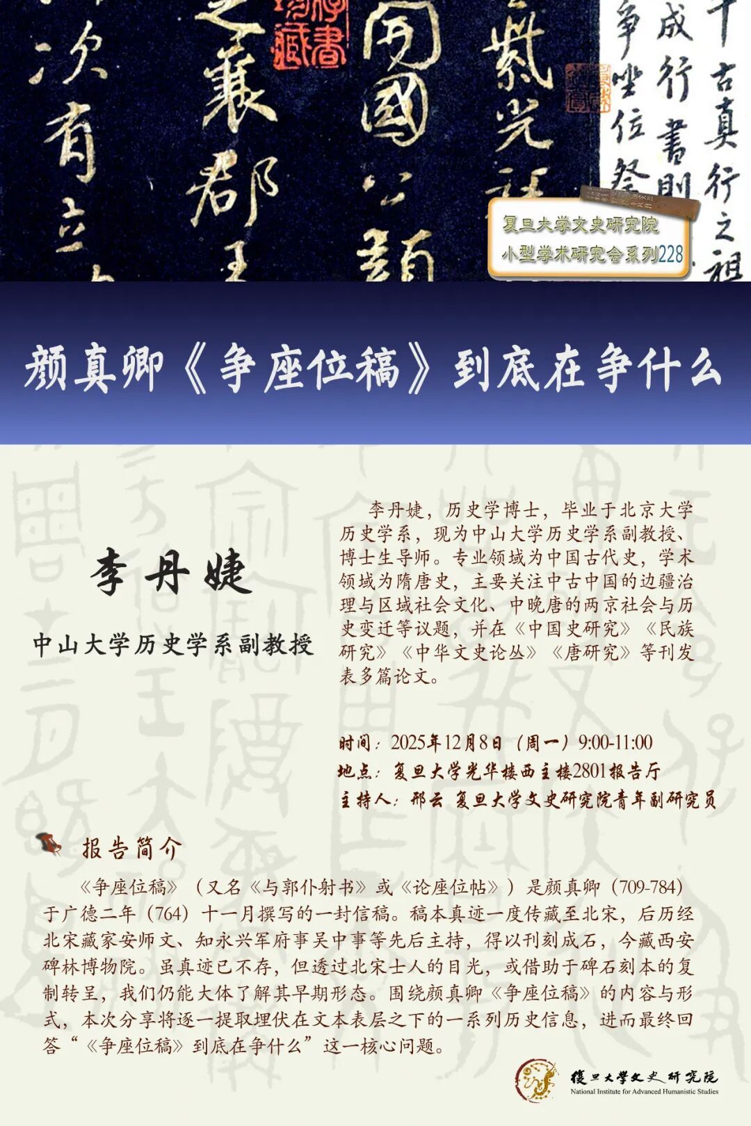 《争座位稿》(又名《与郭仆射书》或《论座位帖》)是颜真卿(709-784)于广德二年(764)十一月撰写的一封信稿。稿本真迹一度传藏至北宋,后历经北宋藏家安师文、知永兴军府事吴中事等先后主持,得以刊刻成石,今藏西安碑林博物院。虽真迹已不存,但透过北宋士人的目光,或借助于碑石刻本的复制转呈,我们仍能大体了解其早期形态。围绕颜真卿《争座位稿》的内容与形式,本次分享将逐一提取埋伏在文本表层之下的一系列历史信息,进而最终回答“《争座位稿》到底在争什么”这一核心问题。