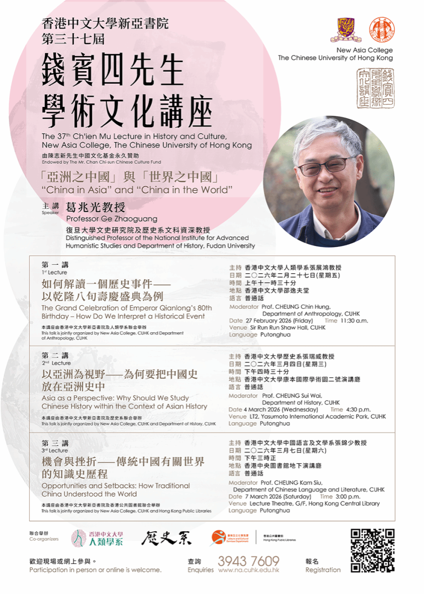 2026年2月27日至3月7日,我院葛兆光教授应香港中文大学新亚书院之邀,主讲第三十七届“钱宾四先生学术文化讲座”,以《“亚洲之中国”与“世界之中国”》为主题展开系列分享。