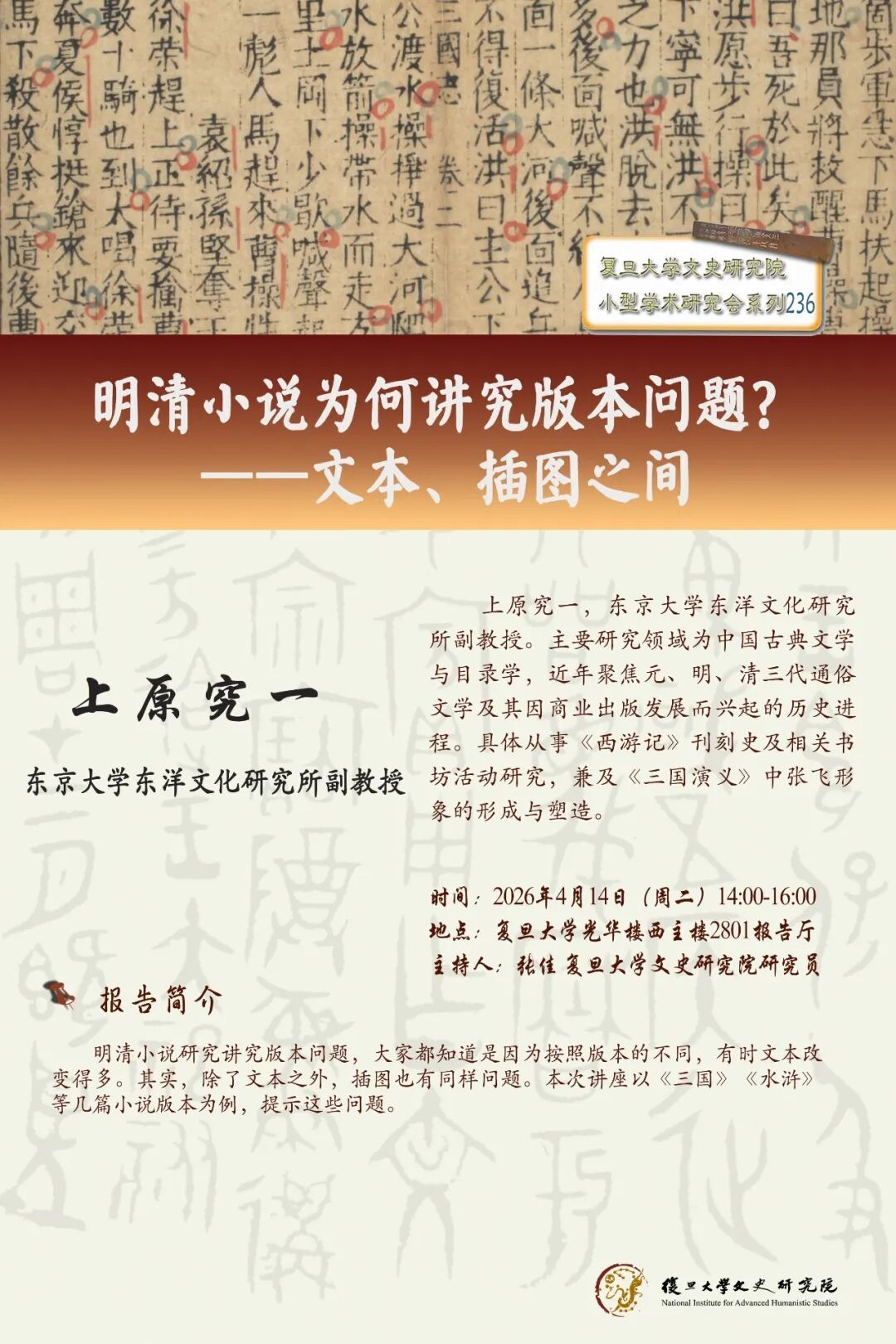 上原究一,东京大学东洋文化研究所副教授。主要研究领域为中国古典文学与目录学,近年聚焦元、明、清三代通俗文学及其因商业出版发展而兴起的历史进程。具体从事《西游记》刊刻史及相关书坊活动研究,兼及《三国演义》中张飞形象的形成与塑造。
